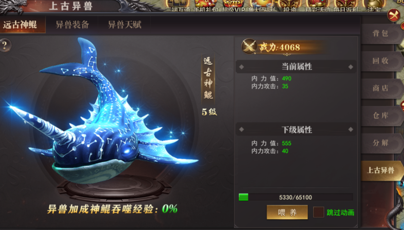 (1).喂养道具可以获取神鲲经验,概率获取异兽装备和碎片