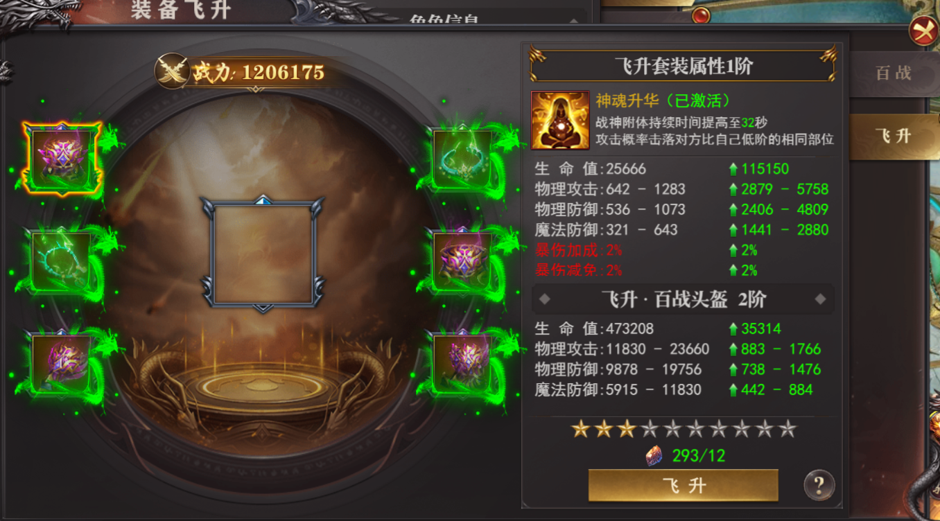 (1)穿戴百战装备才可以进行飞升,且穿戴百战装备时飞升属性才会生效