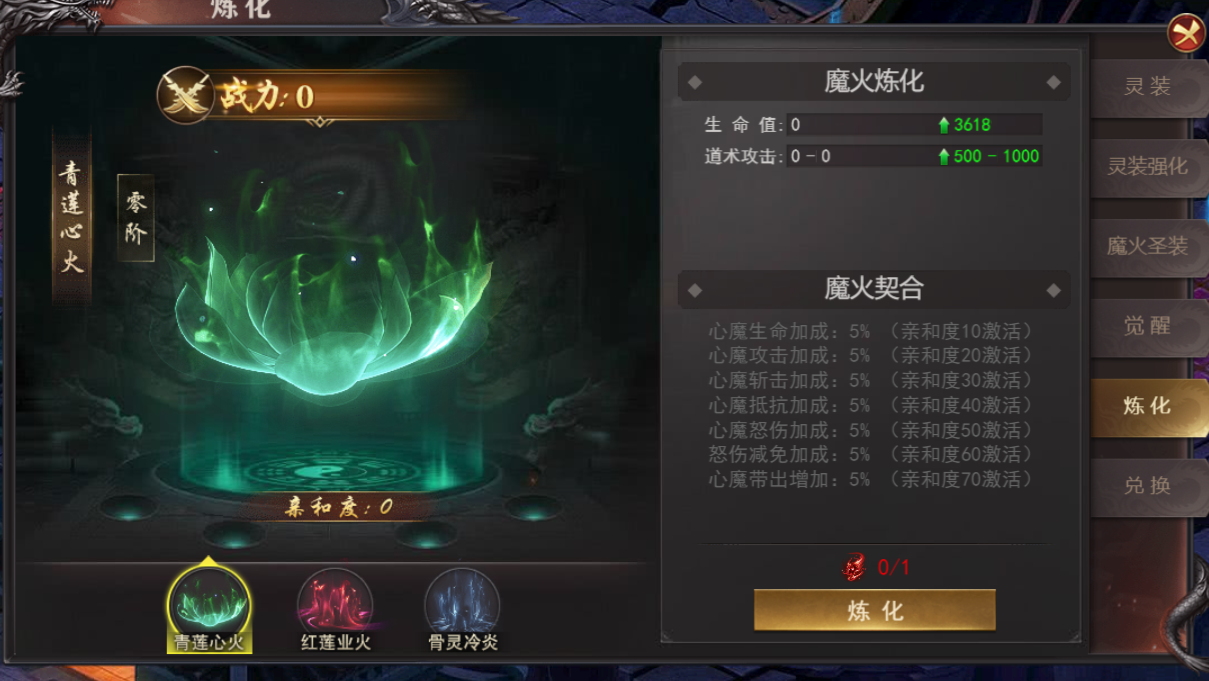 ①.使用道具进行炼化魔火,每次炼化进阶其契合度,契合度达到特定等阶可以激活额外属性
