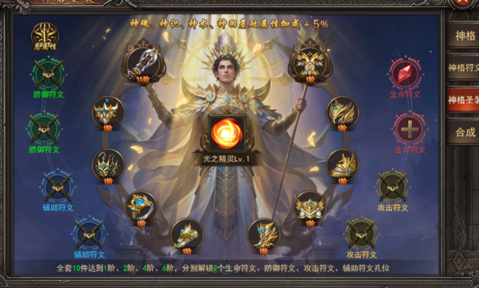 b. 全套10件圣装达到1/2/4/6阶时,可分别解锁对应的生命/防御/攻击/辅助符文孔位;