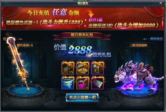【活动内容】:每天充值任意金额,即可获得价值2888钻石的首充道具奖励!首次充值即可获得橙色武器+5,超级经验药,超强宠物技能,还有各种进阶系统装备和进阶道具,绝对值得拥有!