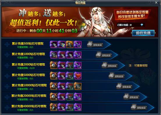 【活动内容】:每日累计充值达到一定额度,即可领取大量珍贵道具奖励,+5、+6、+7、+9装备免费送,充值3888钻石还能获得暗金装备碎片一块!