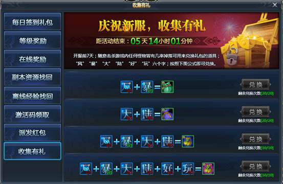 【活动内容】:开服前七天,击杀任意怪物皆有概率掉落“风”“暴”“大”“陆”“好”“玩”道具,收集即可兑换收集礼包,鲜花、灵气、强化石和进阶石礼包等你来拿!