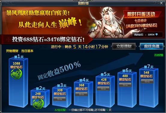 【活动内容】:由风暴大陆专业的理财专家为您提供的理财服务,仅需投资688钻石,即可领取500%超值收益,从此走向人生巅峰!