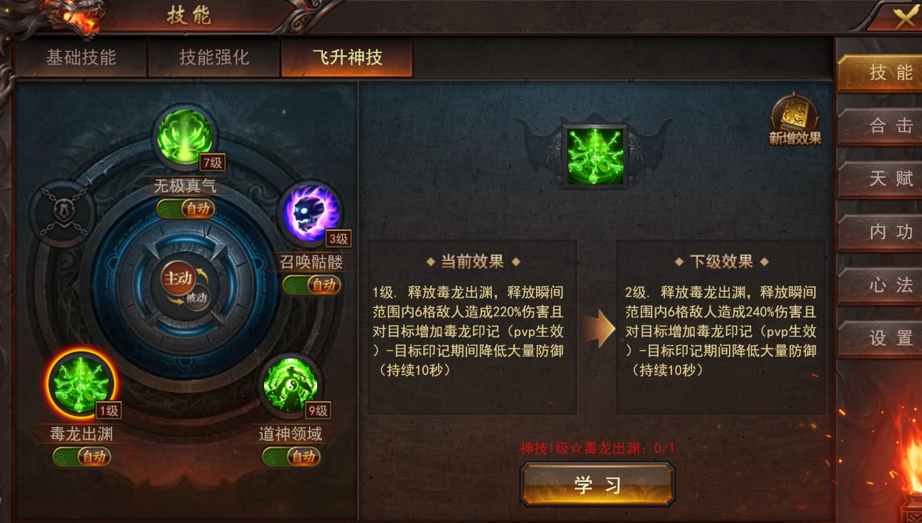 技能效果:释放毒龙出渊,释放瞬间范围内6格敌人造成220%伤害且对目标增加毒龙印记(pvp生效)-目标印记期间降低大量防御(持续10秒)