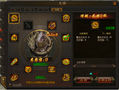 a. 选择装备孔位后消耗龙铸砂增加注砂进度,进度条满后使用龙铸锤提升龙铸等级;
