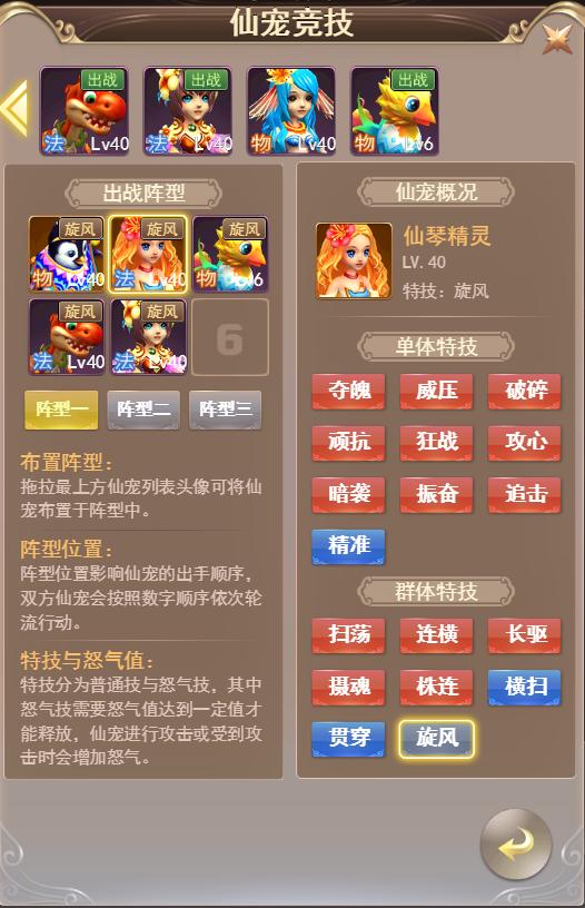 在决战之前,还是先要把你们的宝贝仙宠排好阵型。和幻兽天境一样,这里仙宠的排位,以及技能的选择至关重要!而问题的关键是我们面对的已经不是恒久不变的电脑,而是一个个会思考布局的仙友!成败与否,就在于你上阵什么仙宠,以及如何摆弄阵型和技能。