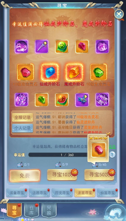 3、每寻宝1次增加1点幸运值,幸运值满必定获得仙戒升阶石或者魔戒升阶石。