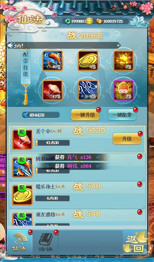 首先就是仙法啦,通过主界面通过到一定关卡,就可以获得仙法,之后还可以升级,提升战力~你,get到了吗