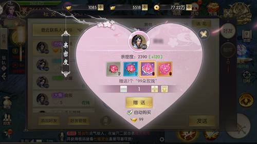 如果玩家找到要结为仙侣的小伙伴,就可以在【聊天界面】向TA送花提高你们的亲密度,当亲密度达到一定时,就可以点【仙侣】的【前往红娘】,找到红娘提亲啦。