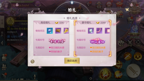 第三步是【婚礼预订】,仙侣们可以选择两种婚宴,都可以获得不同级别的【称号】【时装】和【私囊】,时装奖励会在婚礼后发放。
