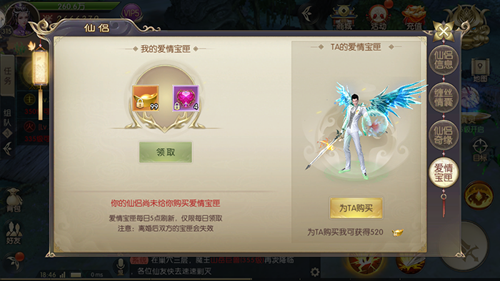 还能给仙侣购买【爱情宝匣】(520元宝),自己会获得520绑元,仙侣每天会获得99绑元和4个三生石哦。