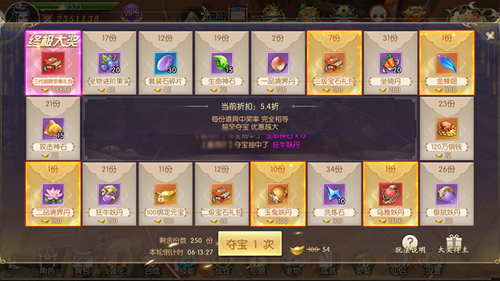 欢乐夺宝中可以用元宝抽取一些稀有的材料,越早抽取,折扣越大(原价100元宝一次)。但是欢乐夺宝抽取的物品多是小幅提战的材料,能大幅提战的顶级材料获得的概率较低。
