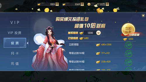 在【月卡】和【投资】里面,玩家可以消费一定的元宝,然后定期换取总价更多的绑元