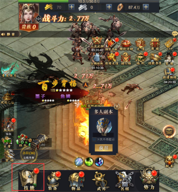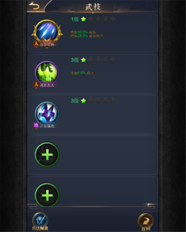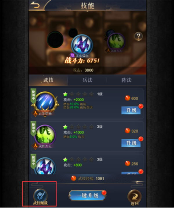 点开游戏界面左下角的“技能”按钮,可以进入你拥有的技能界面,在这里可以激活及学习升级“武技、兵法、阵法”。